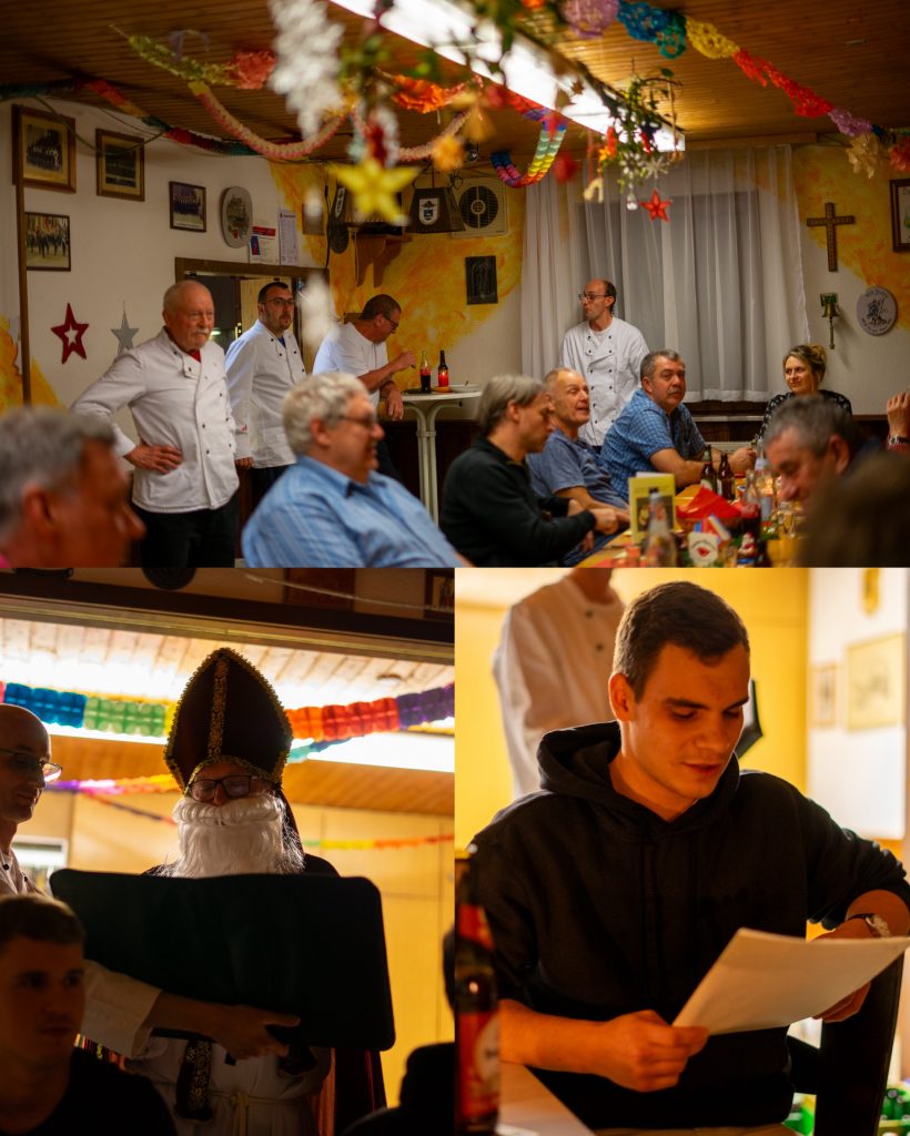 Nach dem gemeinsamen Singen ließ der Besuch des Nikolaus gemeinsam mit Knecht Ruprecht nicht lange auf sich warten. In humorvoller Weise berichtete er, was sich unsere Kameradinnen und Kameraden im Laufe des Jahres alles „zu Schulden kommen lassen“ hatten.